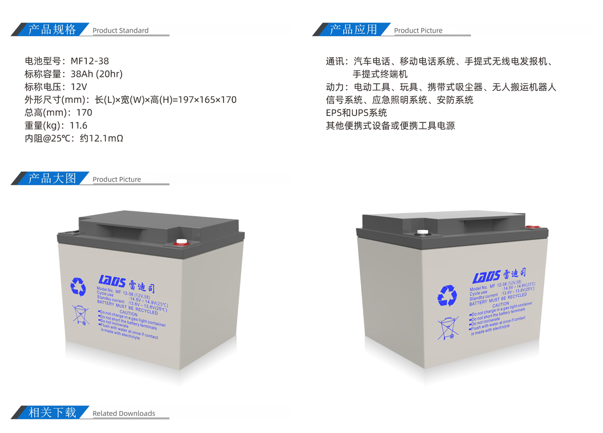 雷迪司MF12-38 12V 38AH閥控密封式鉛酸免維護蓄電池